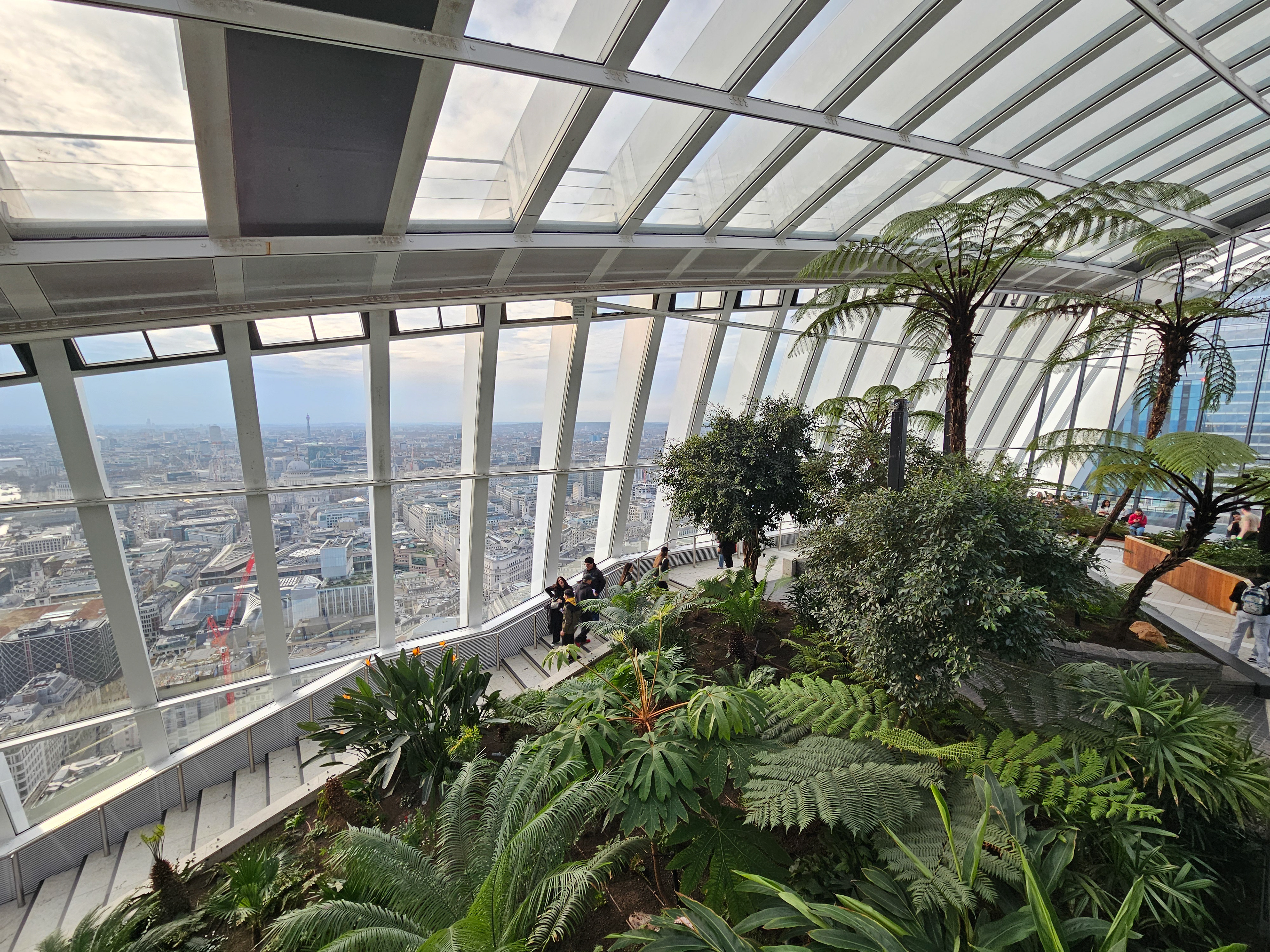 Honrando seu nome, o espaço é um verdadeiro jardim no céu com vistas de 360º, de onde é possível avistar atrações icônicas de Londres com auxílio de adesivos colados nos vidros, como é o caso da St Paul’s, quase apagada pelas construções ao redor, e da região de Greenwich, nos limites de onde a visão alcança.